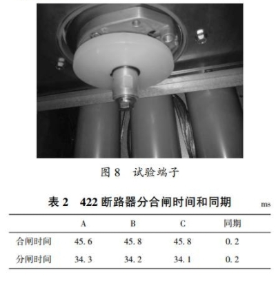 本次實驗選取422斷路器進行機械特性查驗,按圖6進行實驗接線。將4221阻隔開關(guān)置于接地方位,將實驗端子接到柜內(nèi)電纜接口,然后將實驗線接到實驗端子下端進行實驗。實驗端子如圖8所示。422斷路器分合閘時間和同期見表2。